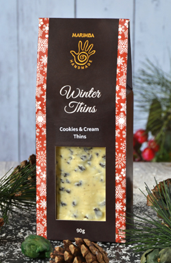 Our Cookies & Cream Thins are a favourite at Marimba HQ. The white chocolate is smooth and creamy and flavoured with additional Madagascan vanilla for a smooth, sweet finish. The cookie crunch adds a deep cocoa taste that is slightly bitter, earthy and unmistakably familiar.